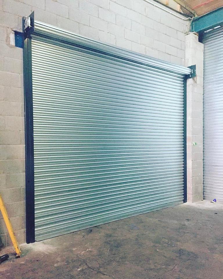 A steel electrically operated roller shutter, fabricated and installed on a warehouse in Oldham.