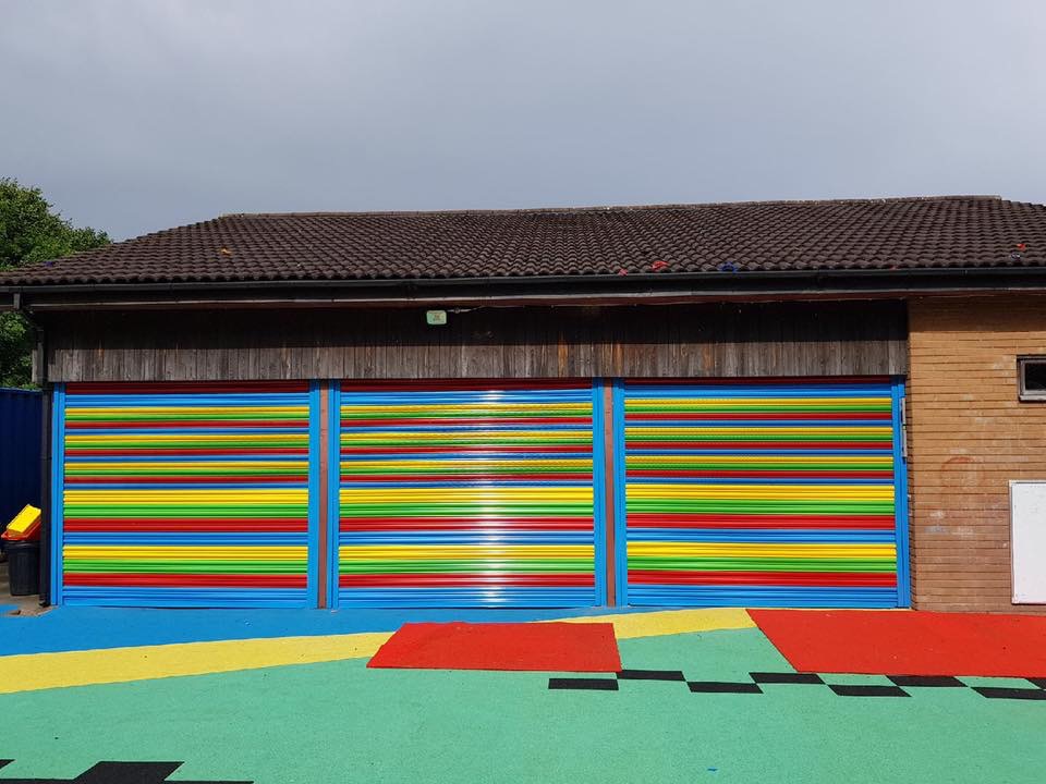 We have installed electrically operated steel roller shutters, powder coated in rainbow colours for a Primary School in Manchester.