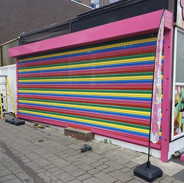 We have installed a steel electrically operated roller shutter to a shop in Rochdale. It has been powder coated in various colours to give a rainbow effect.