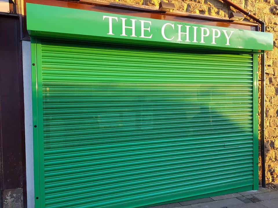We have fabricated and installed a steel electrically operated roller shutter to a shop front, complete with perforated lath and sign lettering. Powder coated finish.